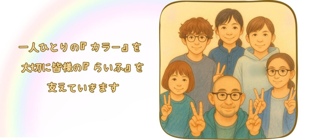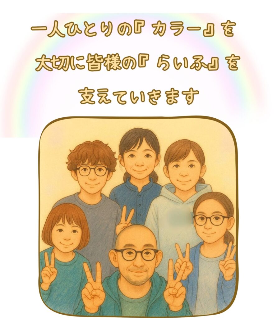 人それぞれ違う価値観や習慣を一つの『色(カラー)』として尊重し、『思いやり』や『配慮』をもって向き合い、高齢や障害、病気を患ったとしても一人ひとりの『カラー』を大切にし続けたいという想いで事業所を立ち上げました!